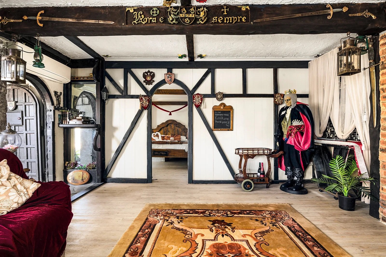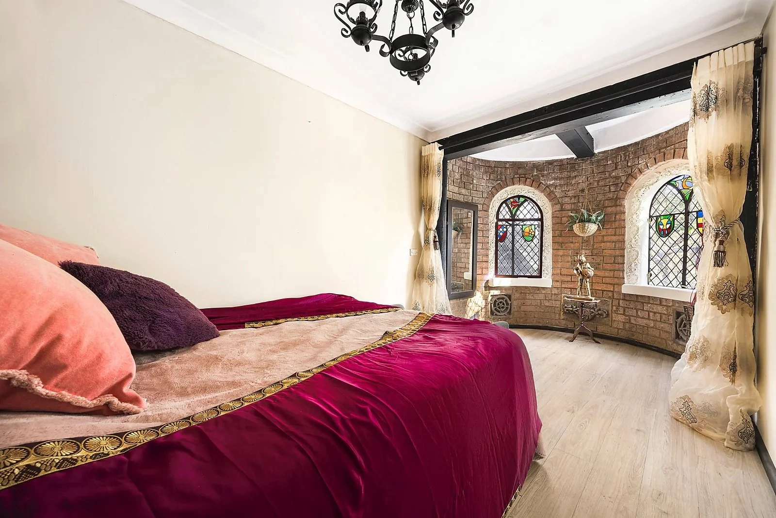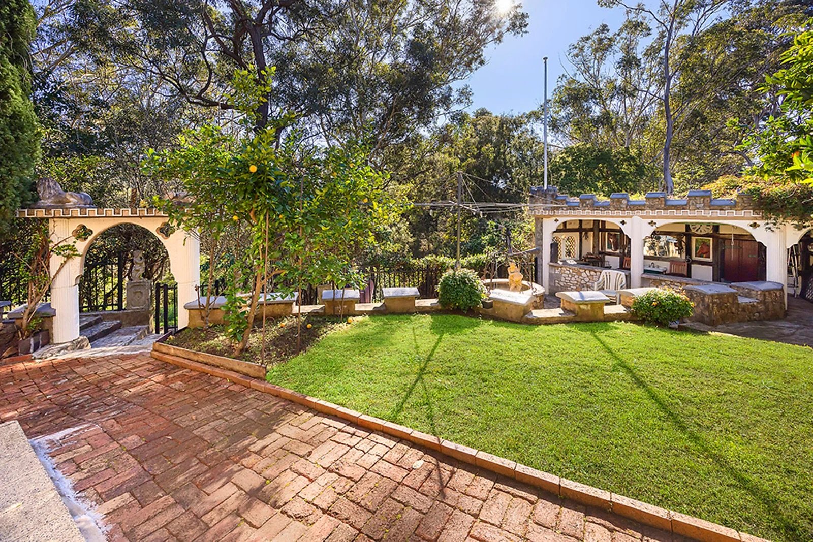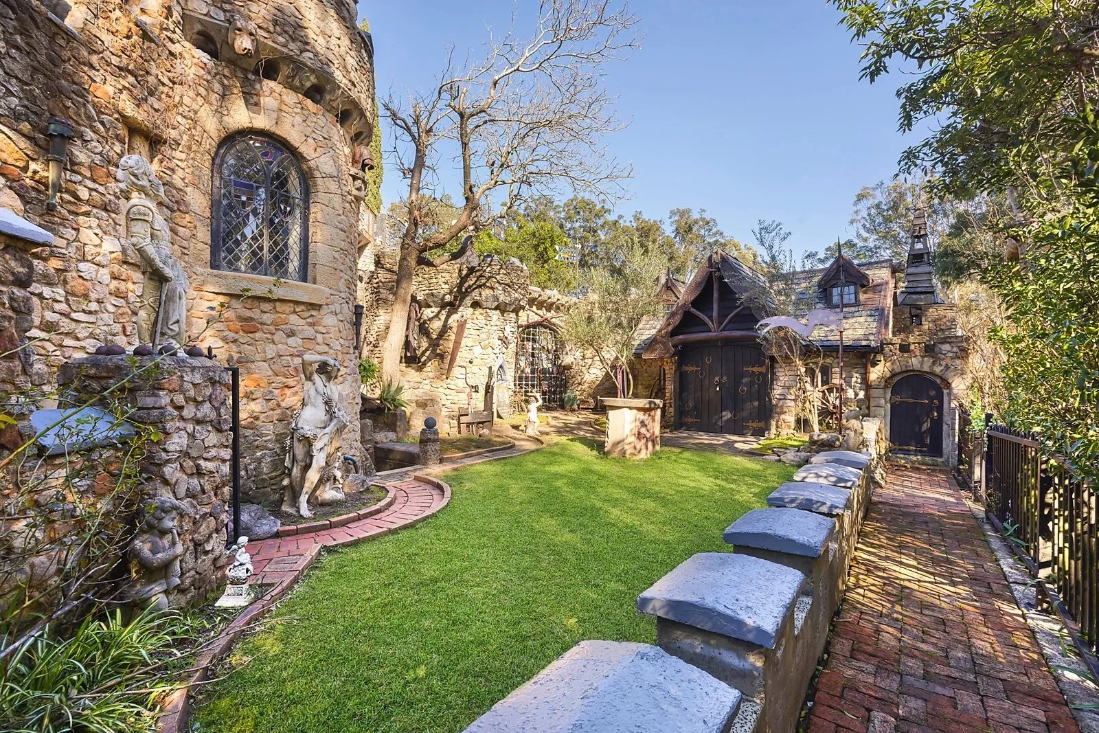 Castle turrets, sandstone arches & wrought-iron detailing